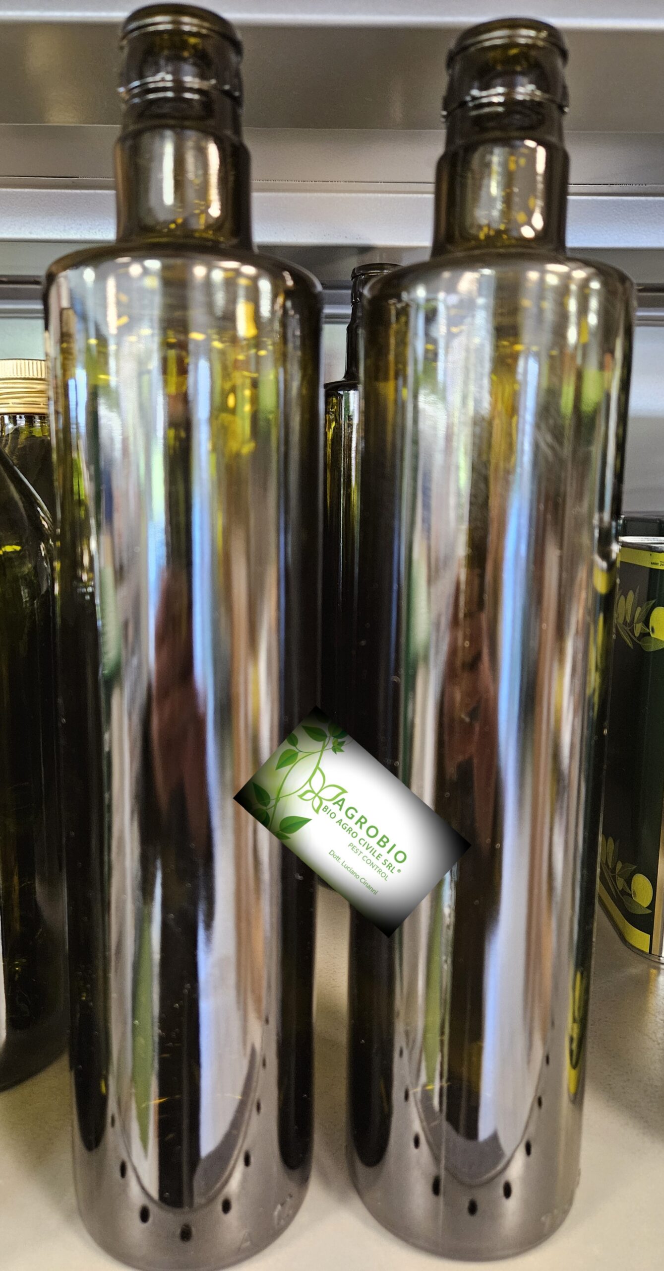 BOTTIGLIE OLIO VETRO SCURO MOLTO ELEGANTI ROTONDE DA LT 0.75 CON TAPPO DOSATORE DI PLASTICA CHE SI INSERISCE A PRESSIONE.
